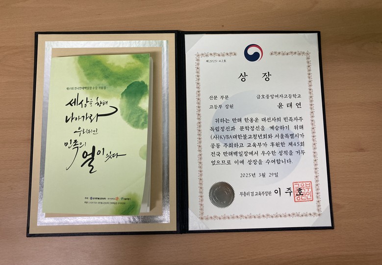 [광주 세계타임즈=손권일 기자] 금호중앙여자고등학교 윤태연 학생(3학년)이 지난 3월 1일 동국대학교 서울캠퍼스에서 열린 ‘제45회 전국만해백일장’에서 장원(교육부장관상)을 수상했다.