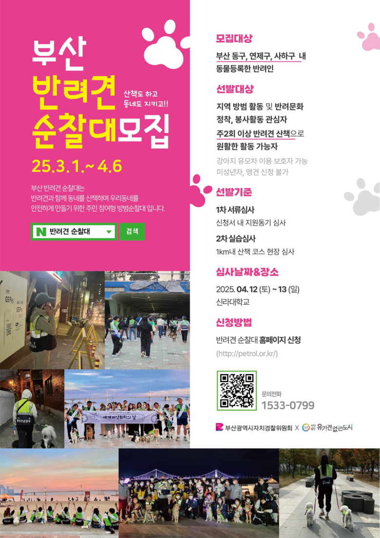 김철준 시 자치경찰위원장은 “「부산 반려견 순찰대」는 시민이 자발적으로 참여하는 지역 치안 활동으로, 시민들이 체감할 수 있는 생활 안전망을 강화하는 데 중요한 역할을 하고 있다. 부산 전역 확대를 목표로 지역 공동체 치안의 모범적인 사례가 될 수 있도록 노력할 것”이라며, “이번 순찰대원 모집에 시민 여러분들의 많은 관심과 적극적인 참여를 부탁드린다”라고 전했다.