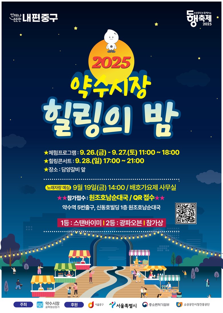 구 관계자는 “맛과 정이 넘쳐나는 약수시장에서 가을 정취와 함께 ‘힐링의 밤’을 만끽해 보시길 바란다”며 “이번 축제가 상권에는 활기를, 방문객에게는 즐거운 추억을 안겨주길 기대한다”고 말했다.