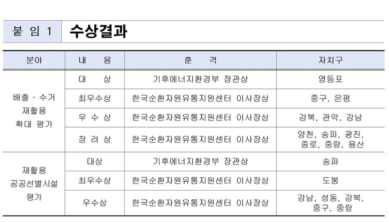 자치구별 재활용 성과를 기반으로 진행한「2025년 서울시 자치구 재활용 성과평가」에서 14개 구가 재활용 우수기관으로 선정되었다.