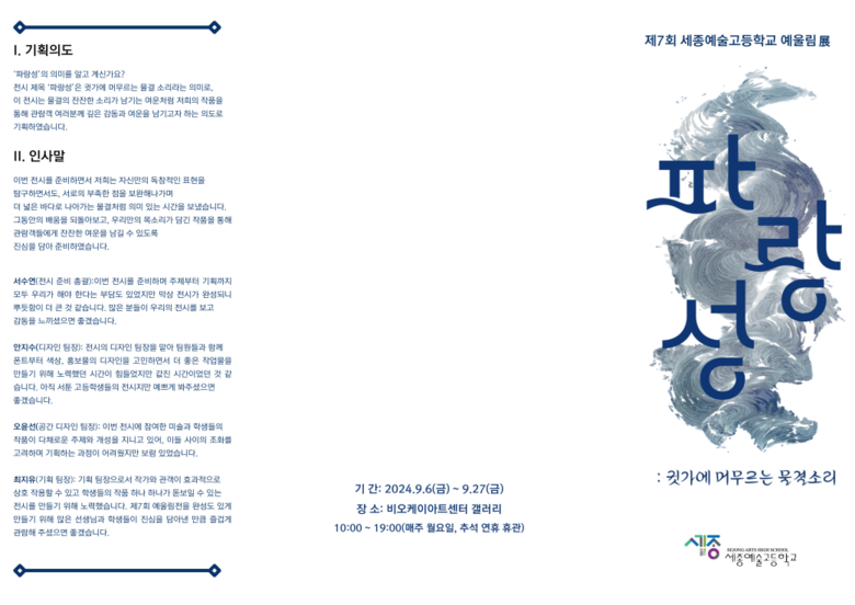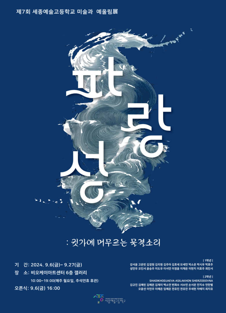 - 파랑성(波浪聲), 귓가에 머무르는 물결 소리’ 주제로 전시 열려 - [세종 세계타임즈=이채봉 기자] 세종예술고등학교(교장 황덕수, 이하 세종예술고) 미술과 학생 작품 전시회인 예울림 전(展)이 9월 6일부터 27일까지 비오케이 아트센터에서 ‘파랑성(波浪聲), 귓가에 머무르는 물결 소리’라는 주제로 열린다.