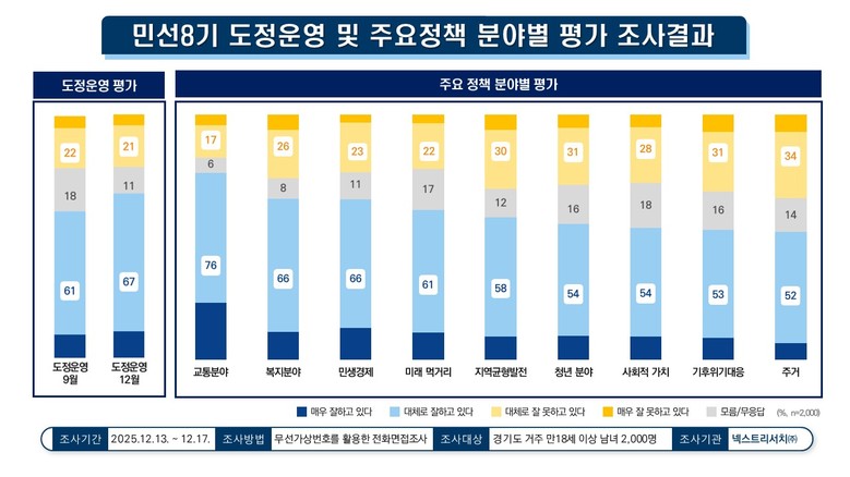 정책 분야별 평가 결과, 교통 분야 긍정 평가가 76%로 가장 높게 나타났으며, 민생경제와 복지 분야는 각각 66%, 미래먹거리 분야는 61%로 집계됐다. 지역균형발전 58%, 기후위기 대응과 청년 분야는 각각 54%, 사회적 가치 분야는 53%였으며, 주거 분야도 52%로 긍정 평가가 과반을 기록했다.