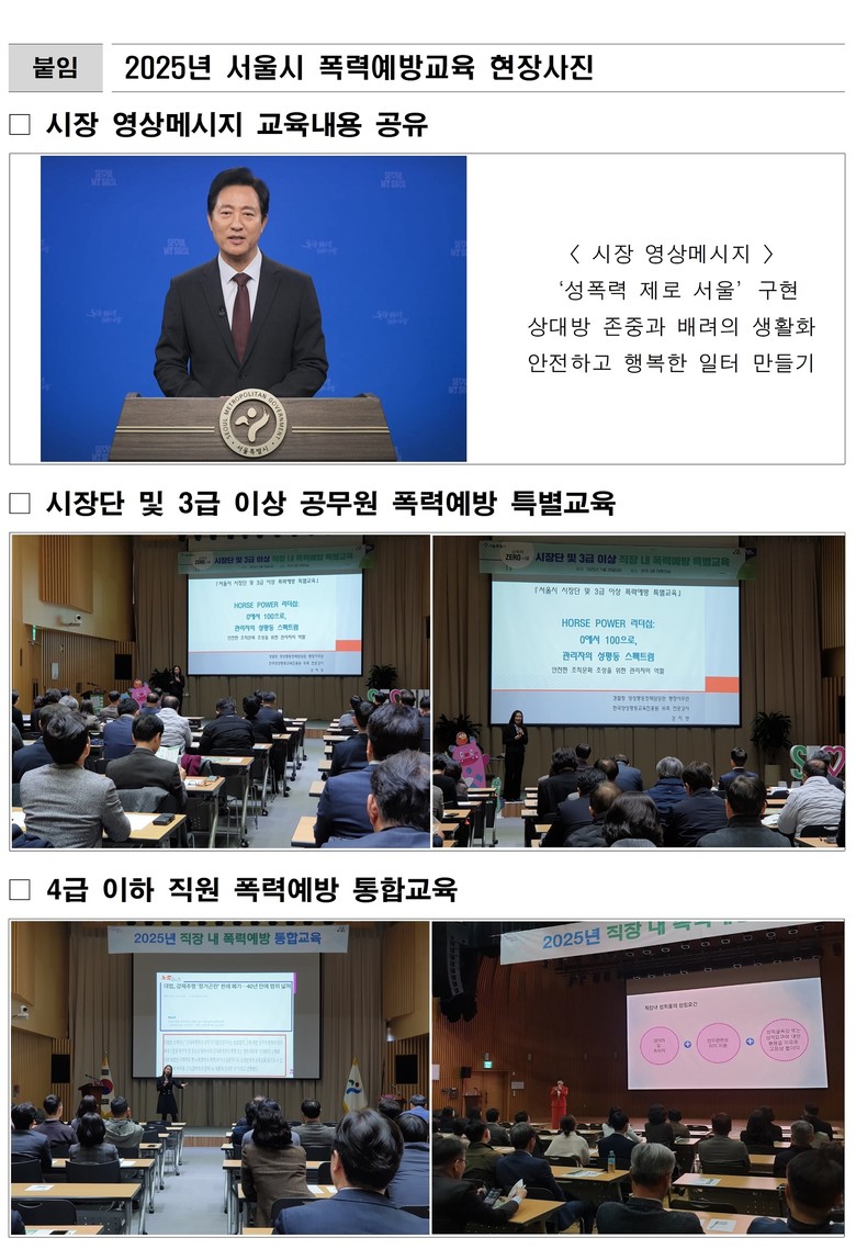 2025년 서울시 직원 대상 ‘직장 내 성희롱·성폭력 예방 특별교육’은 ▴시장단 및 3급 이상 고위직 대상 1회 ▴4급 관리자 대상 6회 ▴5급 이하 직원 대상 10회 ▴공무직·공공안전관·기간제 대상 4회 ▴고충 상담원 전문교육 2회 ▴사업소·투자출연기관 대상 찾아가는 폭력 예방 교육 52회로 총 75회 대면교육을 실시했다.
