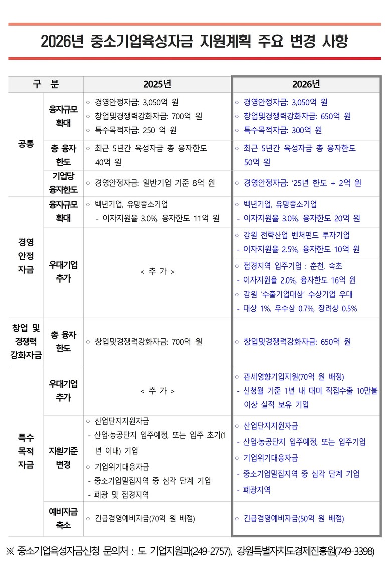 [강원도 세계타임즈=김민석 기자] 강원특별자치도는 도내 중소기업의 경영 안정을 지원하고 지역경제 활성화를 도모하기 위해 총 4,000억 원 규모의 2026년도 중소기업육성자금 운용계획을 확정했다.