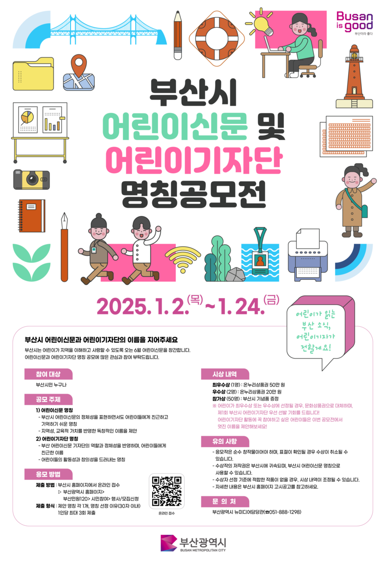 박광명 시 대변인은 “부산 어린이신문과 기자단은 어린이들의 참여를 통해 지역사회의 미래를 이끌어갈 중요한 프로젝트”라며, “프로젝트의 첫 시작 단계인 이번 명칭 공모에 시민 여러분의 많은 관심과 참여를 바란다”라고 전했다.