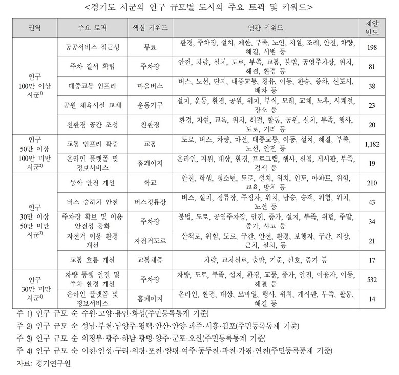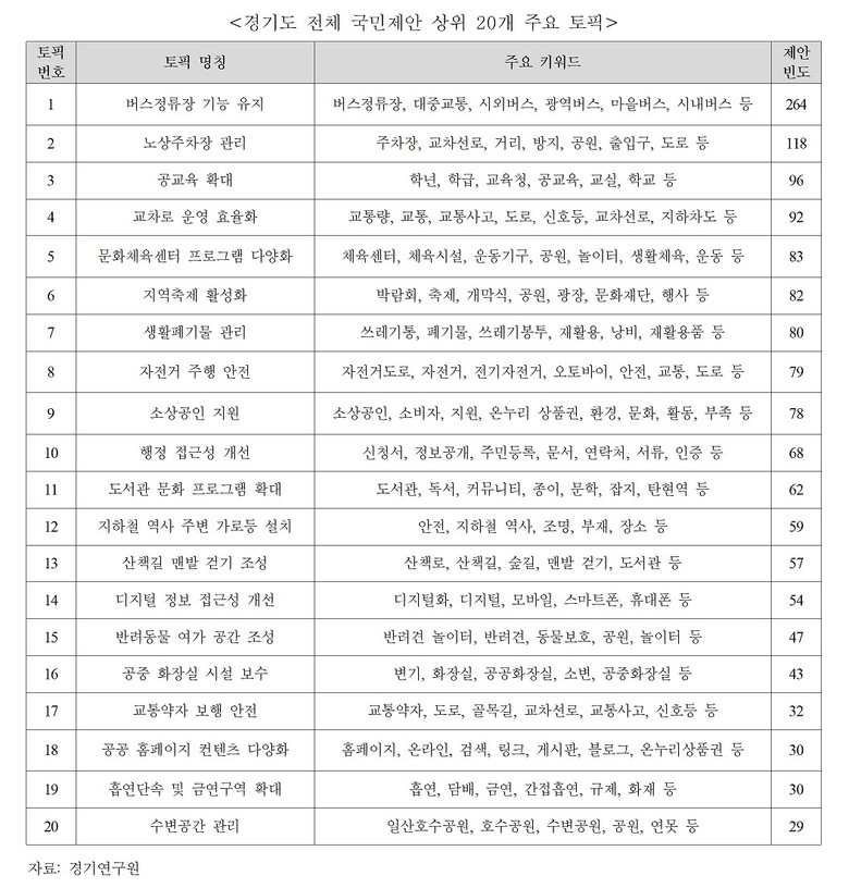 진정규 경기연구원 연구위원은 “도민들이 직접 제안한 수천 건의 아이디어는 정책의 빈틈을 메워주는 소중한 보물지도와 같다”며 “앞으로 도민 10명 중 8명이 원했던 생활 밀착형 인프라 설치 요구에 적극 응답하는 것은 물론, AI 기술을 활용해 도민의 작은 목소리 하나도 놓치지 않고 정책에 담아내는 선제적 대응 체계를 갖추는 것이 무엇보다 중요하다”고 조언했다.