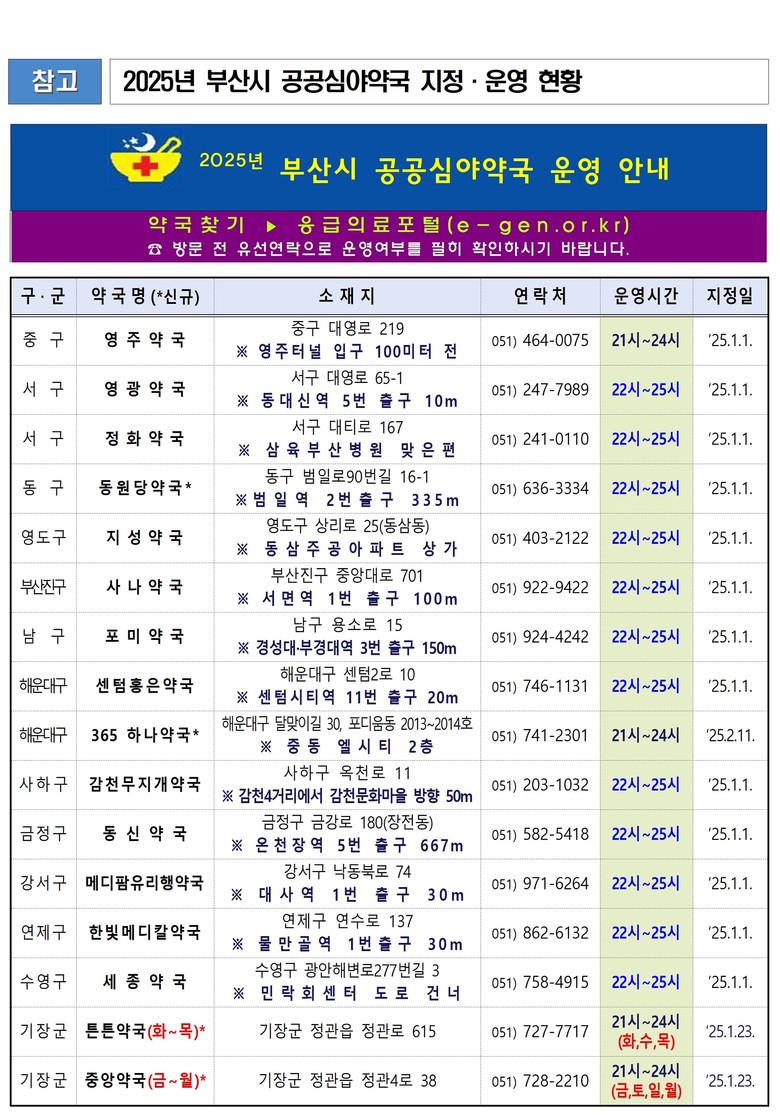 또한, 공공심야약국 모집이 어려운 기장군은 요일제로 운영되는 등, 지역 여건에 따라 탄력적인 운영 방식을 적극적으로 도입해 공공심야약국 지정 공백이 없도록 했다.