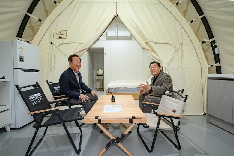 | ▲ 수원시 관계자들이 청량산 수원캠핑장 글램핑 시설에서 대화를 나누고 있다. |