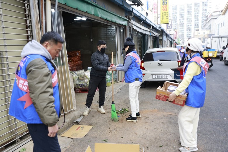 [세계타임즈]최성룡기자 = '이 비티에스 협동조합'경남연수원 (원장 이수진) 회원들은 어시장 길가의 노점상 야채와 건어물을 판매하는 상인들에게 사랑 나눔 따듯한 팥죽과 시루떡으로 온정을 베풀었다.