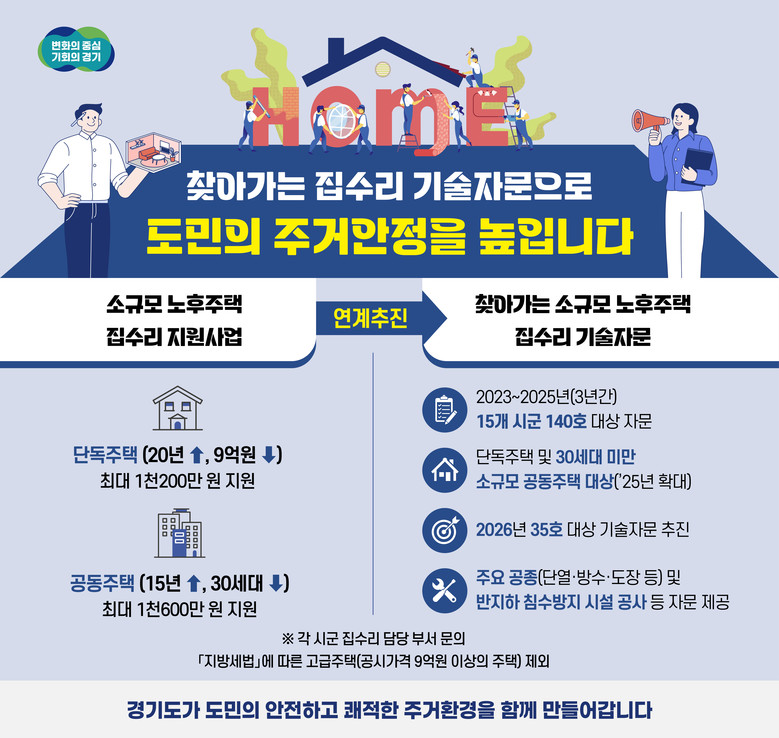 2023년부터 3년간 15개 시군 총 140곳을 대상으로 건축시공 및 설비 분야 전문가가 집수리 현장에 직접 방문해 단열, 방수, 도장 등 주요 공종과 반지하 침수방지 시설 공사 등에 대한 자문을 진행해 왔다. 올해는 시군에서 추천한 35곳을 대상으로 기술자문을 추진한다.