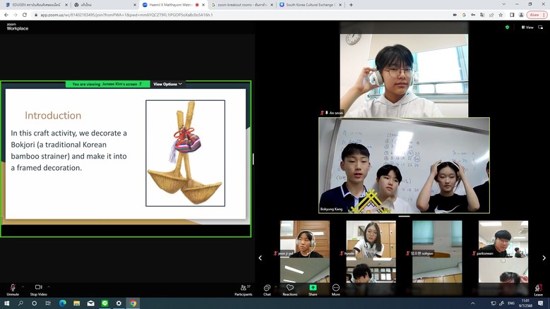 1차시에서는 Zoom을 활용한 실시간 영상 통화를 통해 양국 학생들이 서로 인사를 나누고 자기소개를 하는 시간을 가졌으며, 2차시에서는 각국 전통 공예를 체험한 후, 완성된 작품을 사진으로 촬영해 공유했다.
