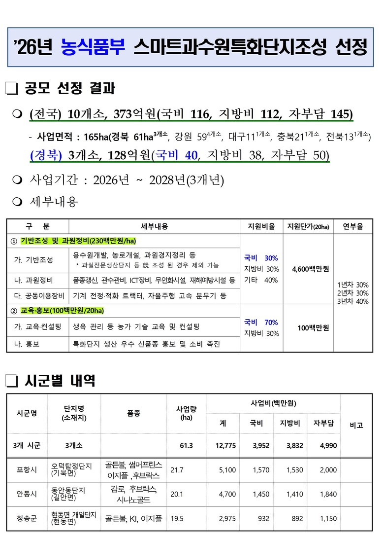농식품부는 10월 공모를 시작으로 1차 서면평가, 2차 발표평가를 거쳐 전국 10개소, 165ha를 선정했으며, 경북도는 3개소, 61ha가 최종 선정되어 전국에서 최다 사업량을 확보하게 되었다.