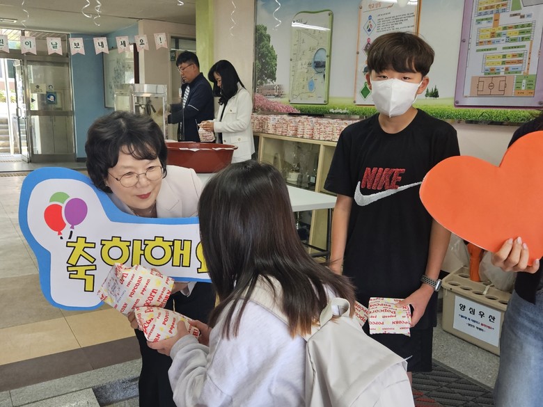 교직원과 학부모, 교육지원청에서 감동과 응원의 메시지를 담은 피켓을 들고 반갑게 학생들에게 인사하며 맞아 주었다. 또 추억의 팝콘을 직접 튀겨 등교하는 학생들에 전하기도 했다.