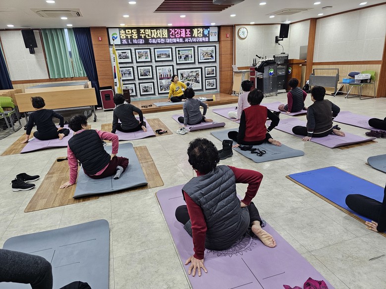 [서구 세계타임즈=이용우 기자] 부산 서구 충무동 주민자치위원회(위원장 최덕원)는 주민들의 문화생활 증진을 위하여 건강체조 프로그램을 개강하였다. 건강체조는 서구체육회 지원으로 지역 주민들의 건강하고 행복한 삶을 위하여 1월부터 12월까지 매주 금요일 운영된다.