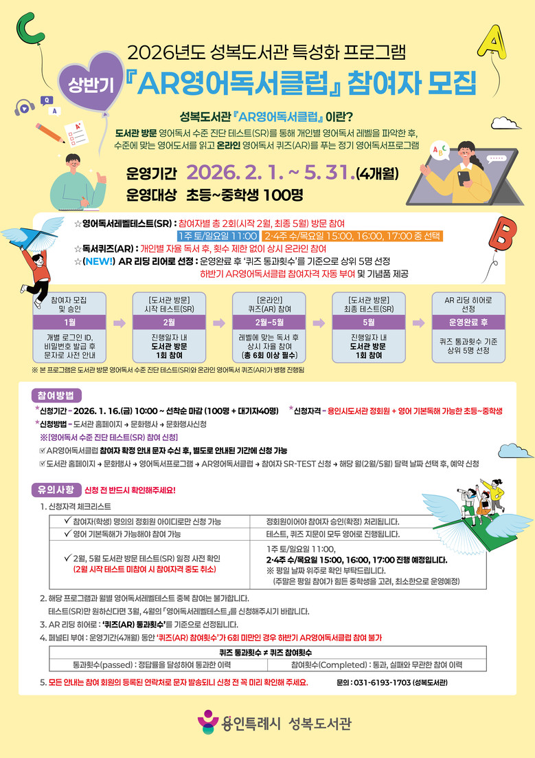 시 관계자는 “AR영어독서클럽 참여자는 도서관에 방문해 영어독서 수준 진단 등을 거친 후 수준에 맞는 영어 원서를 읽고, 온라인으로 영어 독서 퀴즈를 풀며 영어 실력을 향상시킬 수 있다”며 “상반기 과정 후엔 AR ‘리딩 히어로’ 5명을 뽑아 하반기 AR영어독서클럽 참여자격을 자동으로 부여하는 혜택도 새로 신설했으니 많은 관심과 참여를 부탁드린다”고 말했다.