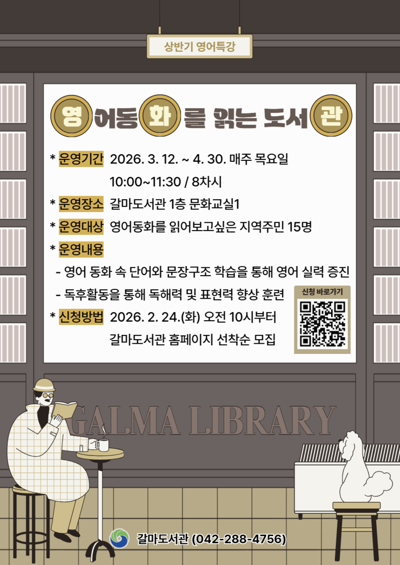 신청은 이달 24일 오전 10시부터 갈마도서관 홈페이지 강좌 신청 메뉴를 통해 가능하며, 주민 15명을 선착순 모집한다.