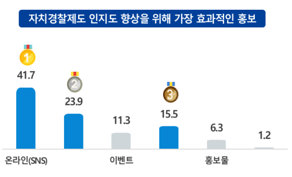자치경찰제를 알게 된 주요 경로로는 언론이 44.7%로 가장 높았으며, 홍보 수단으로는 SNS 등 온라인 매체(41.7%)가 가장 선호되는 것으로 조사됐다. 이는 현재 경북자치경찰위원회가 추진 중인 홍보 전략과도 대체로 일치하는 결과로, 홍보 강화 방안 마련에 참고가 될 전망이다.
