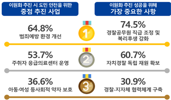 이원화 제도 추진 시 중점 추진 사업으로 도민 안전 확보를 위한 범죄예방 환경 개선사업이 꼽혔으며, 제도의 안정적 정착을 위해 가장 중요한 사항으로 경찰공무원의 직급 체계 정비와 복리후생 강화가 필요하다는 의견이 가장 많았고, 다음으로 자치경찰 독립 재원 확보와 경찰-지자체 협력체계 구축 순으로 조사됐다.