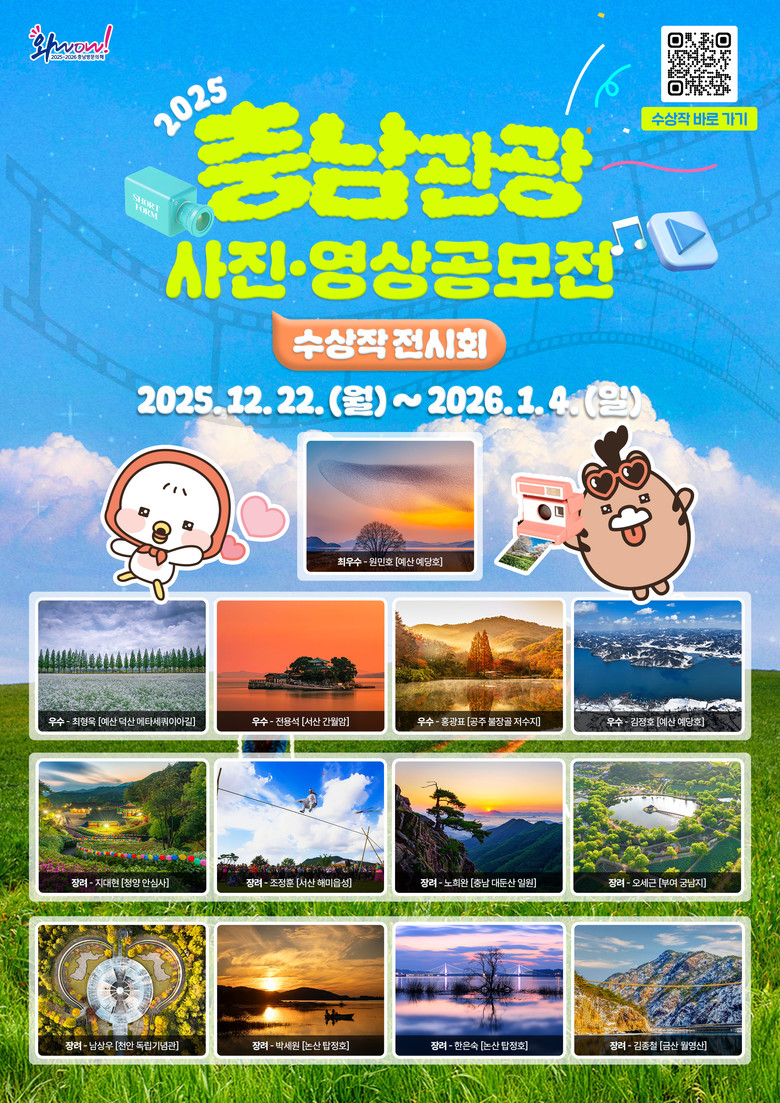 작품들은 각각 최우수상부터 입선작까지 공모전의 영예로운 수상작으로 도내 풍경과 문화, 관광 명소를 독창적이고 감각적으로 표현하고 있으며, 최우수로 선정된 작품은 예산 예당호의 가창오리 군무를 고래처럼 보이도록 연출해 현장감을 생생하게 전달했다.