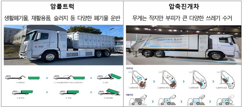 이번에 공개되는 수소청소차는 ▲수소청소차 압축식진개차(9.3톤) ▲수소청소차 압롤트럭(10톤) 두 종류다.