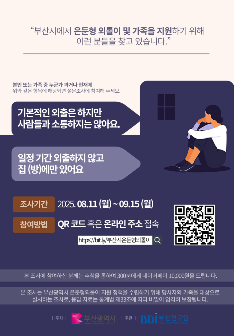 부산에 거주하는 은둔형 외톨이 당사자와 그 가족을 대상으로 한 설문조사는 오늘(11일)부터 9월 15일까지 온라인으로 진행된다.