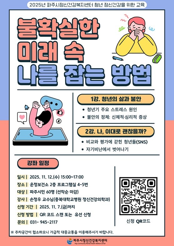 윤탁 파주시정신건강복지센터장은 “이번 강좌가 불안과 자기비난 속에서 힘들어하는 청년들이 스스로를 이해하고 회복하는 데 작은 도움이 되길 바란다”라며 “청년들이 자신의 마음을 돌보는 법을 배우고, 일상 속에서 정신건강을 지켜나갈 수 있는 계기가 되길 기대한다”라고 전했다.