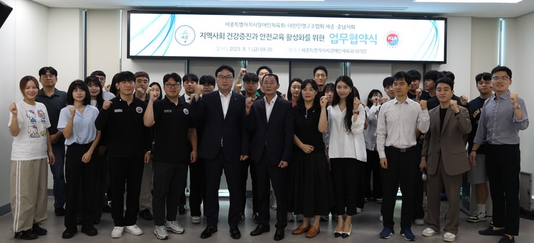 [세종 세계타임즈=이채봉 기자] 세종특별자치시장애인체육회와 대한인명구조협회 세종·충남지회(김지태 회장)가 1일 세종장애인형국민체육센터에서 장애인 체육활동 지원 및 수상안전 강화를 위한 업무협약을 체결했다.