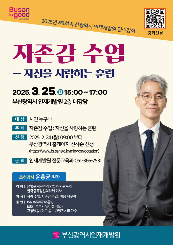 올해 첫 강좌는 베스트셀러 「자존감 수업」의 저자이자 정신건강의학과 전문의인 윤홍균 원장을 초청해 '자존감 수업 : 자신을 사랑하는 훈련'을 주제로 강연을 진행할 예정이다.