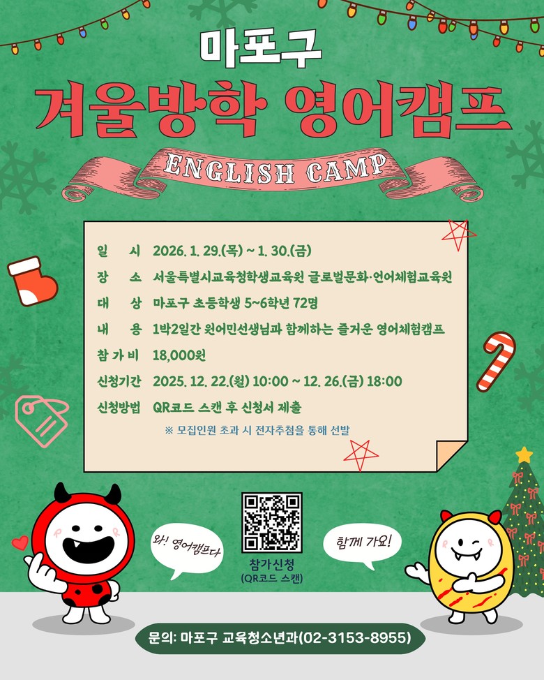 모든 프로그램은 서울특별시교육청 학생교육원 소속 원어민 교사가 운영하며, 마포구는 교육원과 협력해 생활실 관리와 안전교육, 응급상황 대응체계를 체계적으로 마련해 캠프 전반의 안전 관리를 강화할 예정이다.
