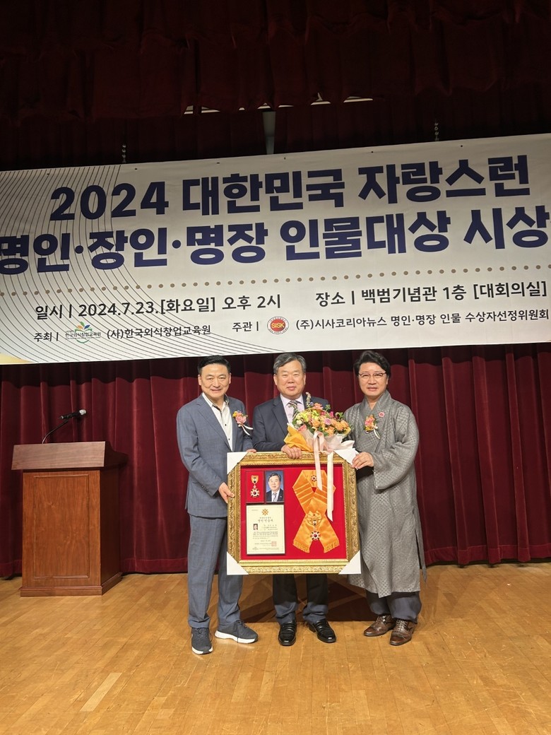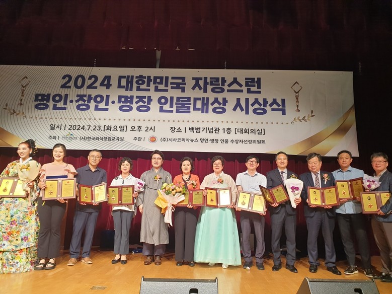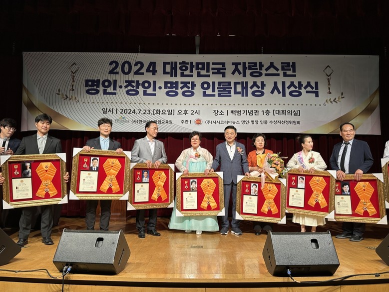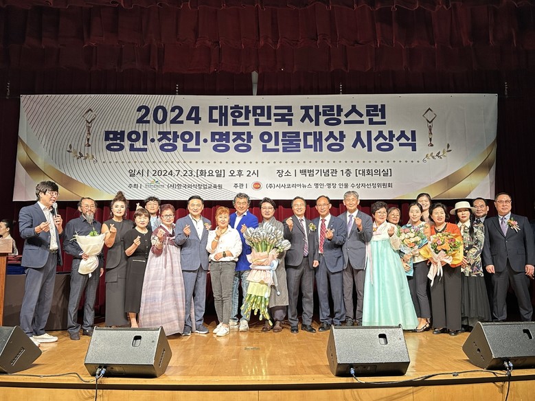 [세계타임즈]최성룡기자 = (사)한국외식창업교육원 주최 시사코리아뉴스 주관으로 2024대한민국 자랑스런 명인.명장 인물대상(大賞) 시상식을 오는 7월23일(화)오후2시 백범기념관에서 개최됐다.