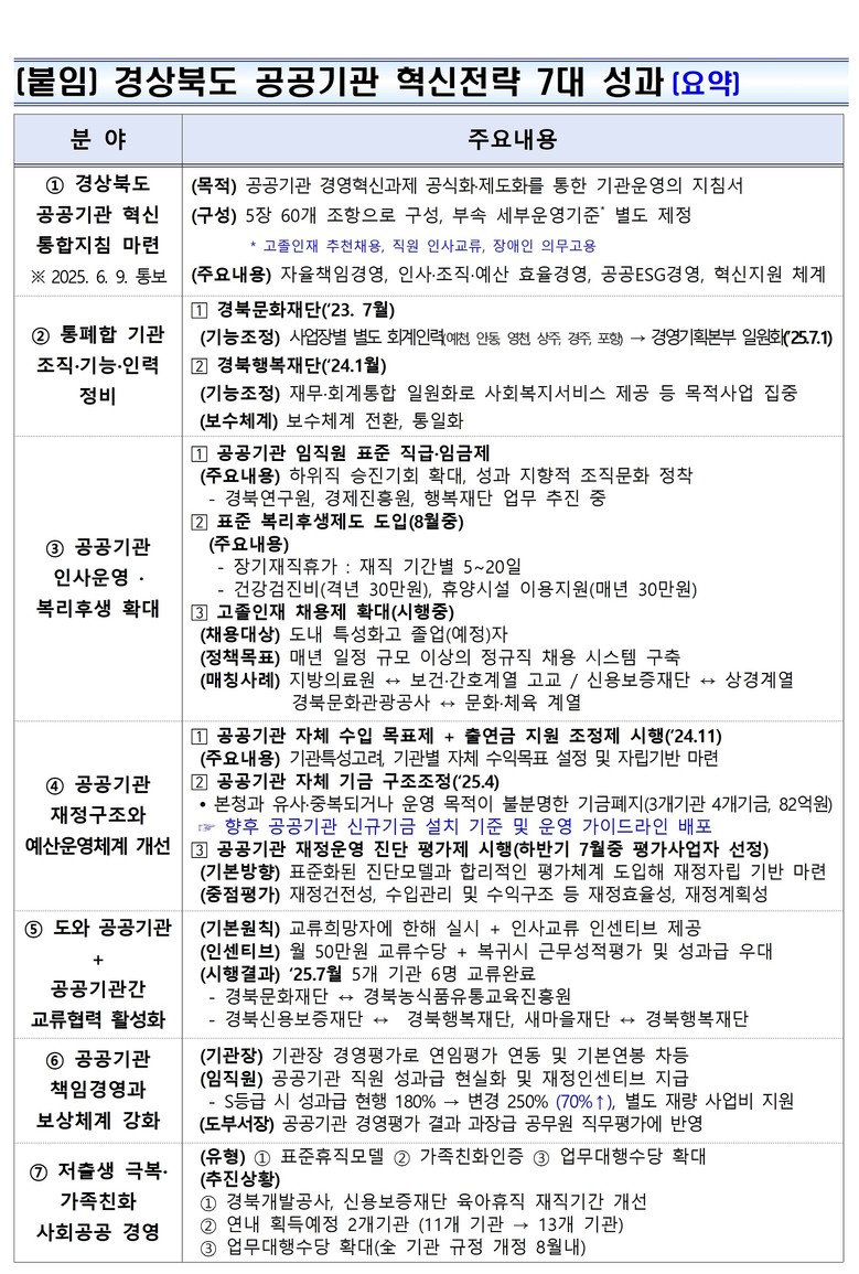 현재 주요 성과로는 ▴광역 최초의 ‘경상북도 공공기관 혁신 통합지침’마련 ▴통폐합기관 조직기능인력 정비 ▴공공기관 인사운영 혁신 및 복리후생 강화 ▴재정구조와 예산운영체계 개선 ▴도와 공공기관 및 공공기관 간 교류 협력 활성화 ▴책임경영 확대와 보상체계 강화 ▴저출생 극복·가족 친화 사회공공 경영강화 등 7대 성과로 다양한 분야에서 구체적인 성과를 달성했다.