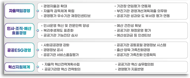재정예산 분야에서는 공공기관의 재정구조 및 예산운영 체계를 개선했다. 자체 수입 목표제와 출연금 조정제를 도입해 기관 특성에 맞춘 공공기관 자율책임 재정체계를 중점 추진했다.
