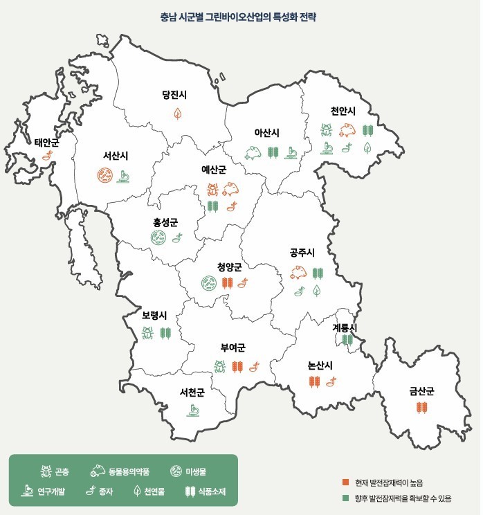 특히 “▲곤충은 천안·예산·부여, ▲동물용의약품은 천안·예산·공주, ▲미생물은 서산·홍성·청양, ▲식품소재는 논산·금산·부여·청양, ▲연구개발은 천안·서천, ▲종자는 예산·부여·청양·논산, ▲천연물은 당진·예산 등에서 권역별 특성화 전략을 펼쳐야 할 것”이라고 말했다.