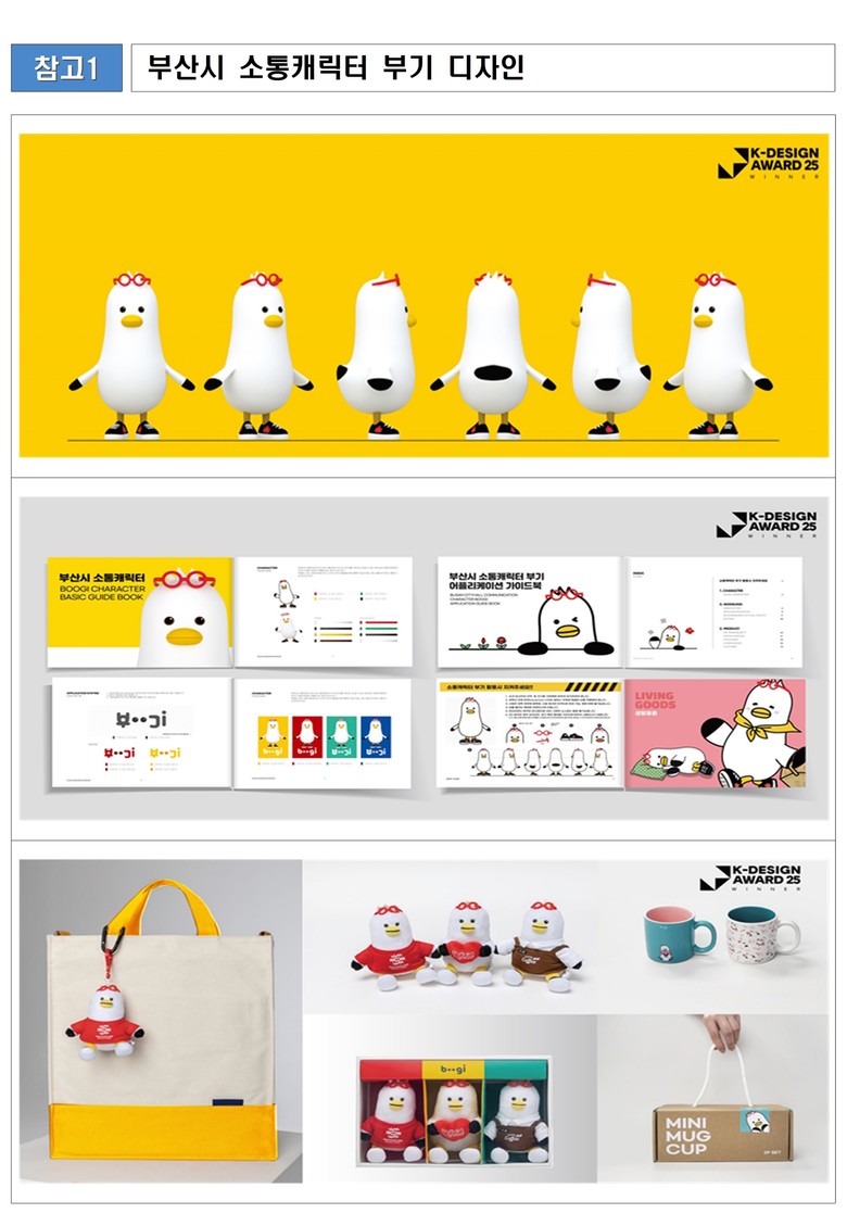 부산의 대표 소통 캐릭터인 부기는 부산을 상징하는 갈매기를 동기(모티브)로 제작됐으며, 빨간색 스마트 안경과 지역 산업을 반영한 맞춤형 신발을 통해 도시 정체성을 효과적으로 드러냈다는 평가를 받았다.