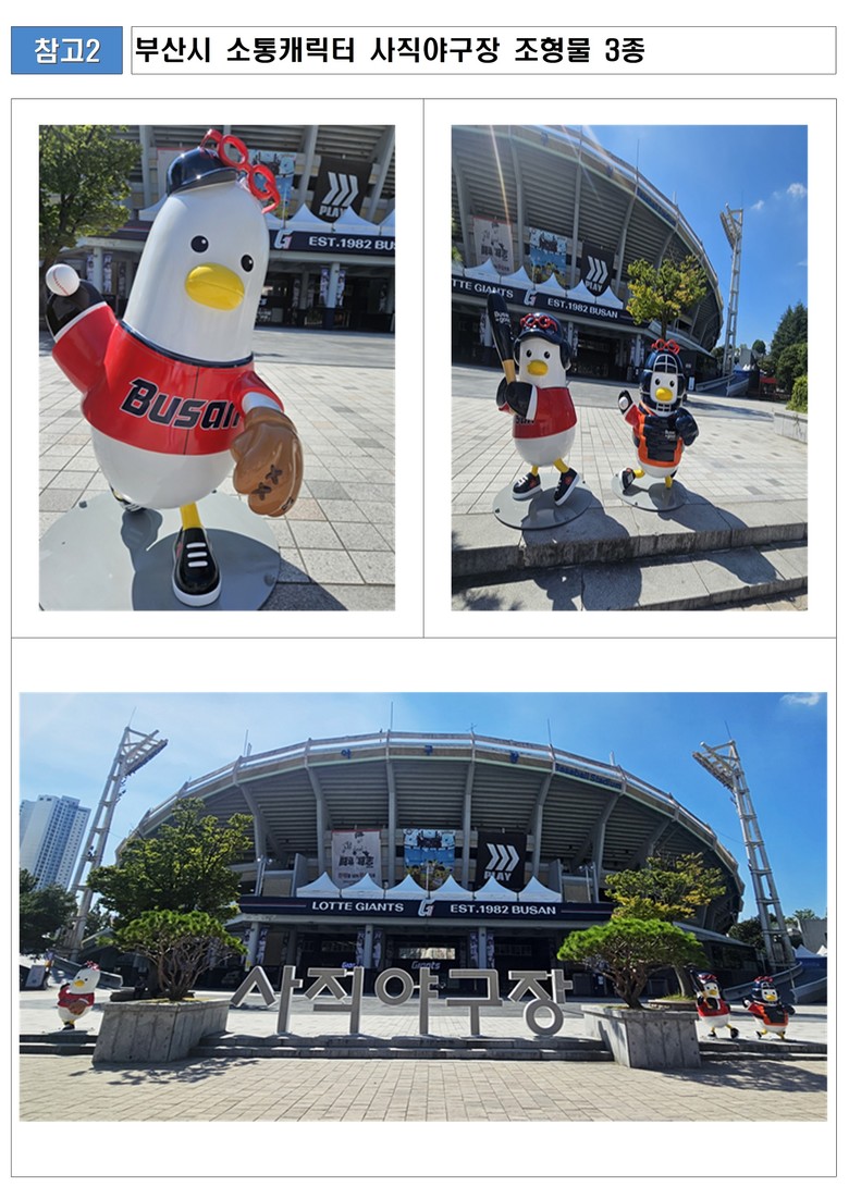 한편, 시는 사직야구장에 야구를 주제로 부기 조형물 3종을 설치했다. 이번 '사직야구장 부기존'은 타자·투수·포수의 동작을 입체적으로 형상화해 야구 경기의 주요 순간을 실감 나게 표현한 것이 특징이다.