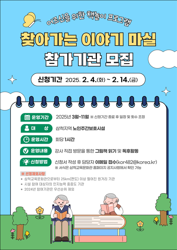 김범중 삼척교육문화관장은 “어르신들이 책을 통해 상호작용과 인지활동을 활발히 함으로써 양질의 여가생활을 향유하고, 삶의 질을 향상할 수 있길 바란다”고 말했다.