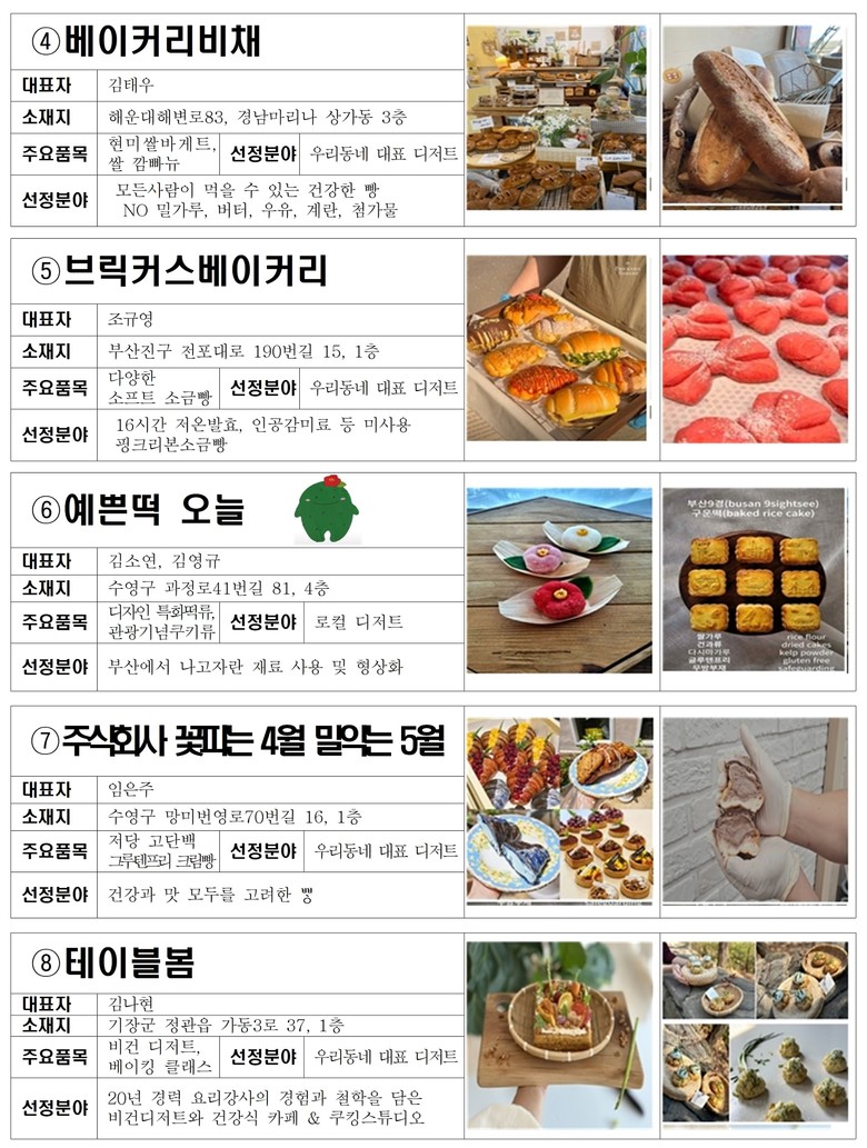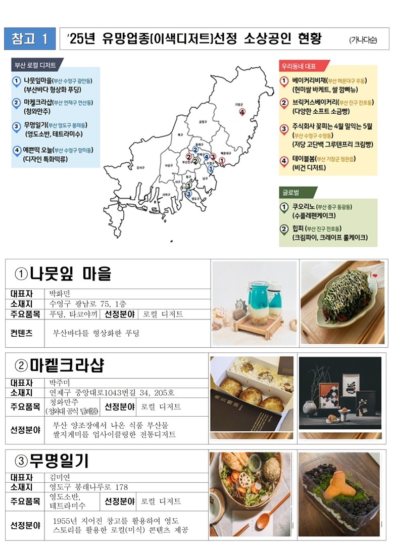 선정업체의 소재지를 보면, 부산의 대표 카페·디저트음식점 밀집 지역인 전포동 카페거리(2곳), 광안리 광리단길(1곳), 망미동 망리단길(1곳), 남포동(1곳), 영도 봉래나루 카페거리(1곳)가 있다.