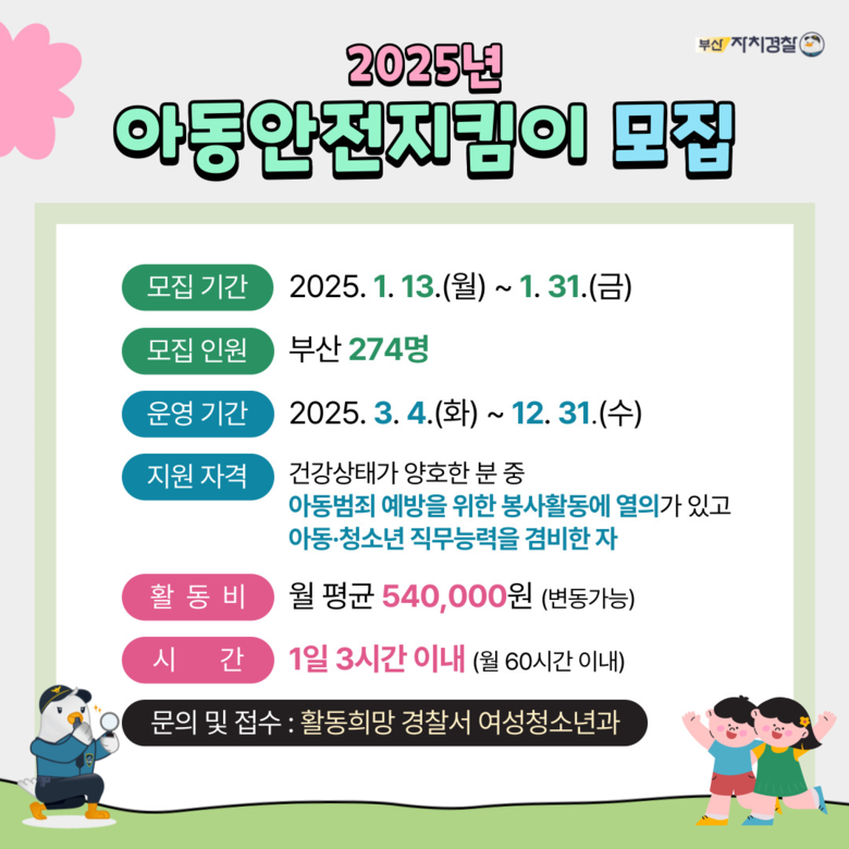 ◈ 봉사활동에 열의가 있는 사람이면 누구나 신청할 수 있어… 1.31.까지 활동 희망 경찰서 여성청소년과로 서류 제출하면 돼 [부산 세계타임즈=이용우 기자] 부산시 자치경찰위원회(위원장 김철준, 이하 위원회)는 부산경찰청과 함께 오는 1월 31일까지 '2025년 아동안전지킴이' 총 274명을 모집한다고 밝혔다.