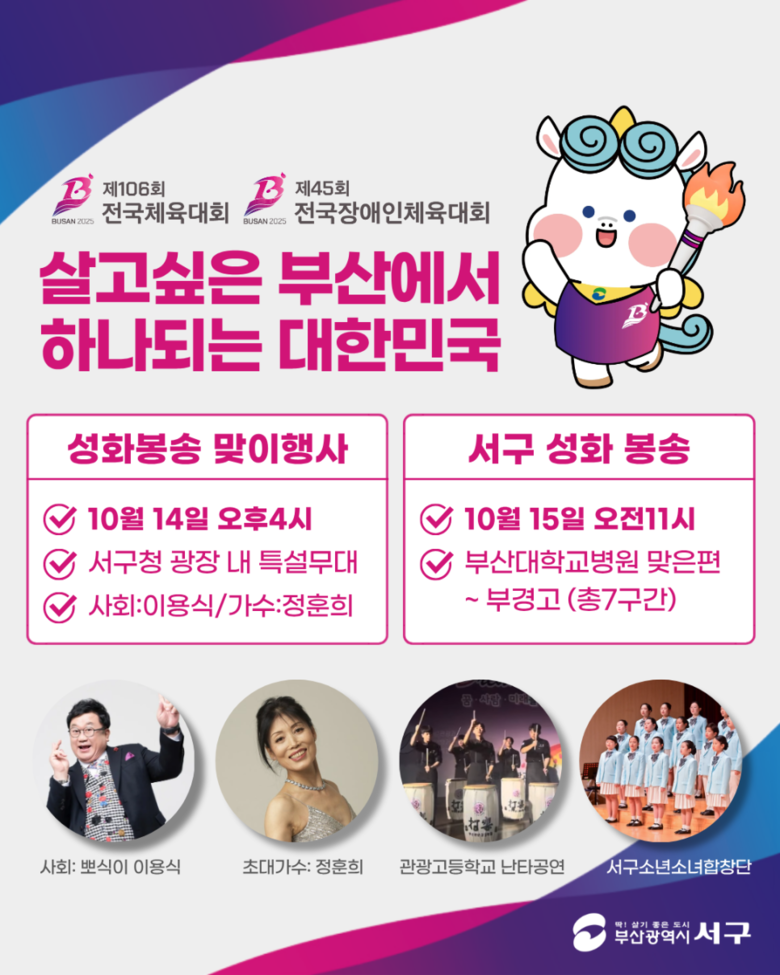 이날 행사는 방송인 이용식 사회로 슬로건퍼포먼스 및 성화 인수·안치 등 공식행사와 서구소년소녀합창단 공연, 부산관광고등학교 난타공연, 서구 출신 가수 정훈희의 축하공연 등 문화공연으로 나누어져 약 1시간 20분 가량 진행될 예정이다.