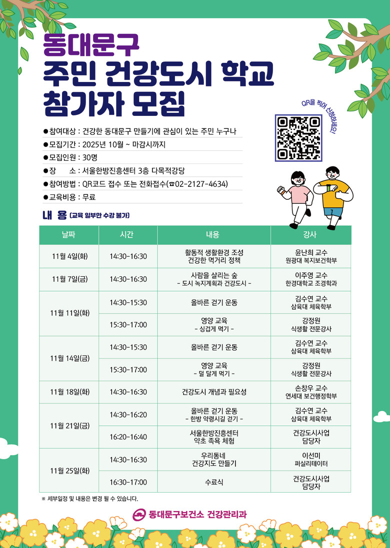 교육은 건강도시 개념과 필요성(연세대 손창우 교수), 활동적 생활환경 조성 및 건강한 먹거리 정책(원광대 윤난희 교수), 사람을 살리는 숲: 도시 녹지계획과 건강도시(한경대 이주영 교수), 올바른 걷기 운동 및 한방 약령시길 걷기(삼육대 김수연 교수), 영양 교육: 싱겁게 먹기, 덜 달게 먹기(강정원 식생활 전문강사), 우리 동네 건강지도 만들기(이선미 퍼실리테이터) 등 총 7회차의 실천 중심 커리큘럼으로 진행된다.