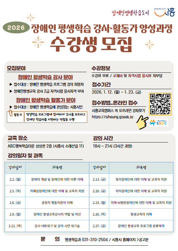 임병택 시흥시장은 “이번 과정은 장애인의 평생학습권을 보장하는 든든한 조력자를 양성하는 과정”이라며, “전문성과 사명감을 갖춘 시민들의 많은 관심과 참여를 바란다”라고 밝혔다.