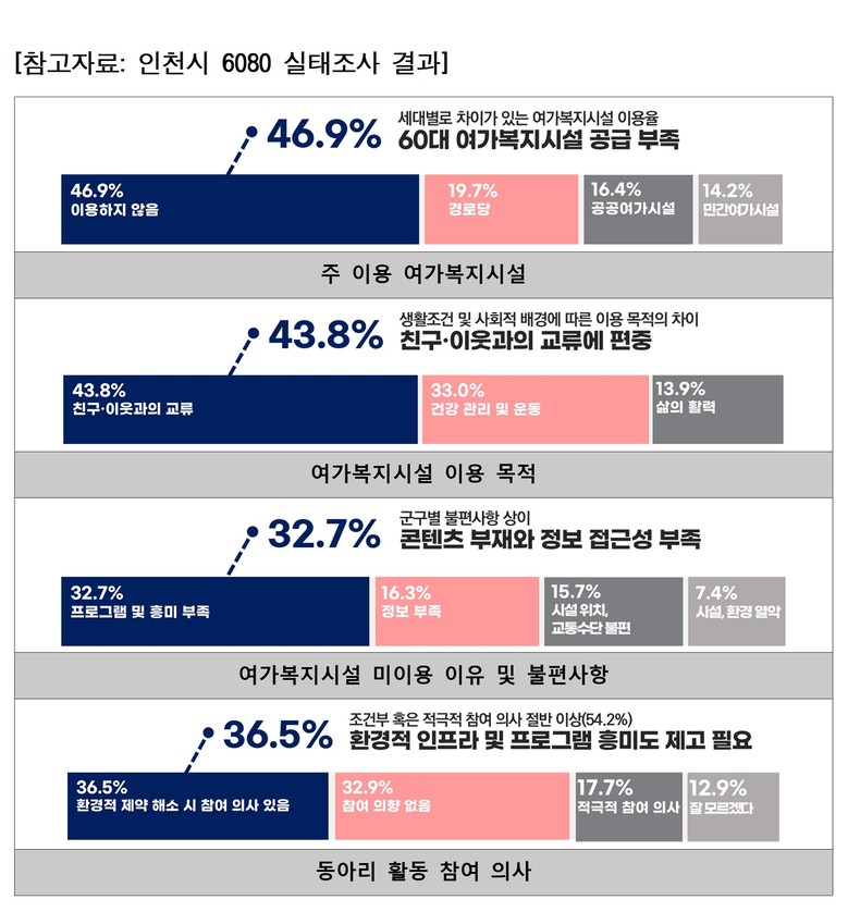 연구 결과, 인천시는 60대 이상 고령인구가 빠르게 증가하고 있으나, 고령자의 사회참여와 평생학습을 지원하는 여가복지시설과 프로그램 공급은 수요에 비해 충분하지 않은 것으로 나타났다. 특히 60대 신노년층의 경우 노인여가복지시설 이용률이 상대적으로 낮아, 기존의 정책이 충분히 작동하지 않는 것으로 분석됐다.