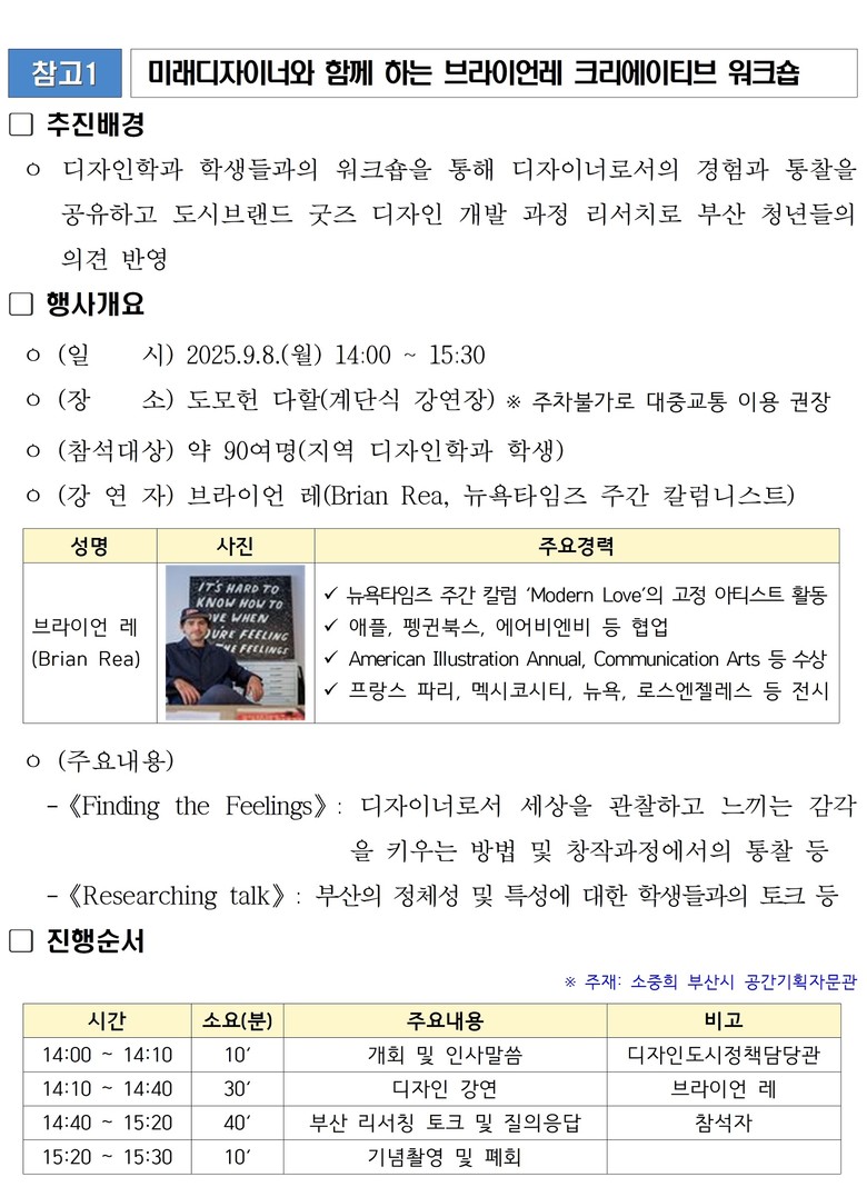 프로그램은 ▲브라이언 레의 디자인 강연 '파인딩 더 필링스(Finding the Feelings)' ▲부산의 핵심 그림(키 비주얼)을 그리기 위한 '대담(부산 리서치 토크)' ▲의견 청취 및 질의응답 순으로 진행된다.