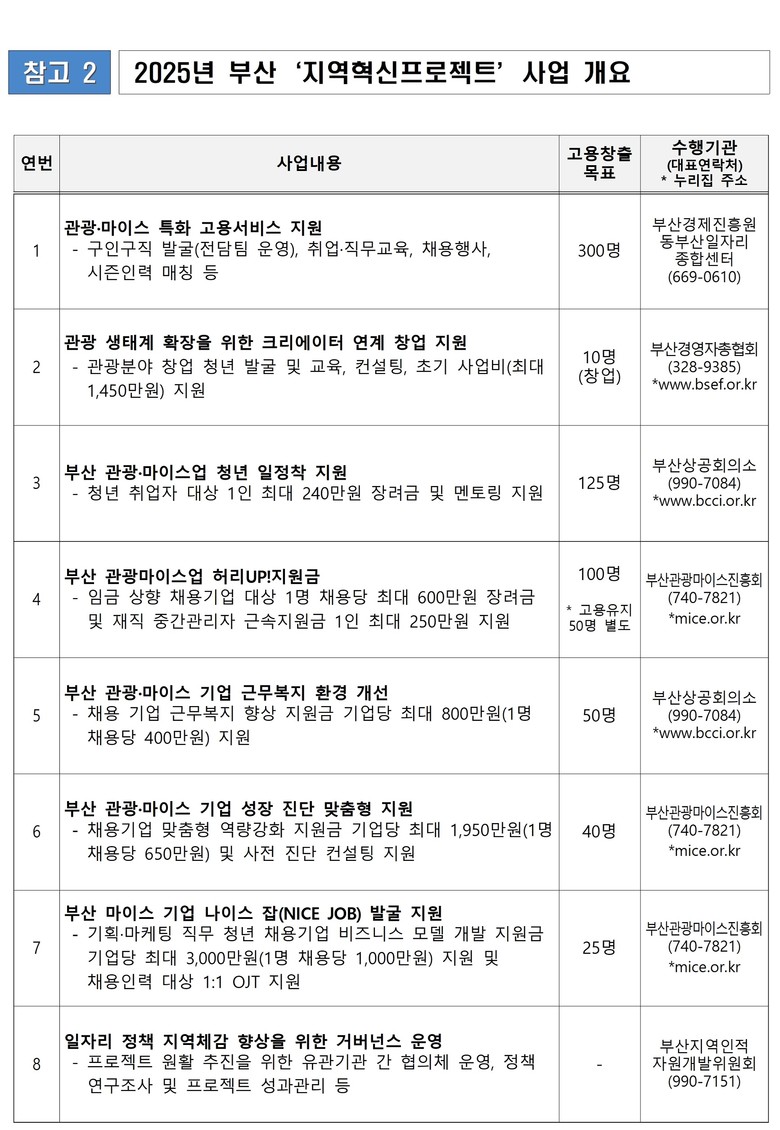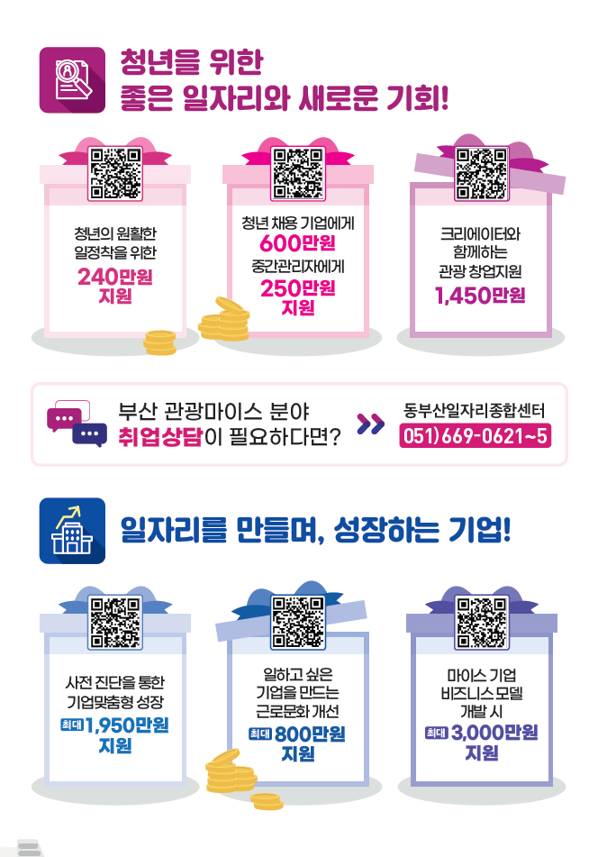 ▲부산 관광·마이스업 청년 일정착 지원(청년 구직자 취업 시 1인당 최대 240만 원 및 멘토링 프로그램 지원) ▲부산 관광·마이스업 허리업(UP)!지원금(임금 수준을 상향해 청년 채용 시 1명 채용당 최대 600만 원, 해당 기업 재직 중간관리자 1인당 최대 250만 원) 지급 등을 추진한다.