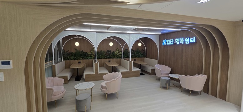 행복쉼터에는 계단형 휴게공간, 포켓형 공간, 창가 테이블, 바(Bar) 테이블 공간을 조성하고, 공간 특성에 맞는 테이블과 의자를 배치했다. 개인 방문객은 물론 가족 단위 이용객도 편리하게 이용할 수 있도록 동선을 정리했으며, 소형 싱크대도 설치했다. 직원과 미화원을 위한 별도 휴게공간도 함께 마련했다.