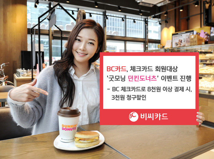 ‘굿모닝 던킨도너츠’ 이벤트는 1월 25일부터 3월 31일까지 오전 시간(7~12시) 내 전국 던킨도너츠 매장을 방문한 고객들 중, BC 체크카드로 8천원 이상 결제하는 회원들에게 3천원 청구할인 혜택을 제공한다.
