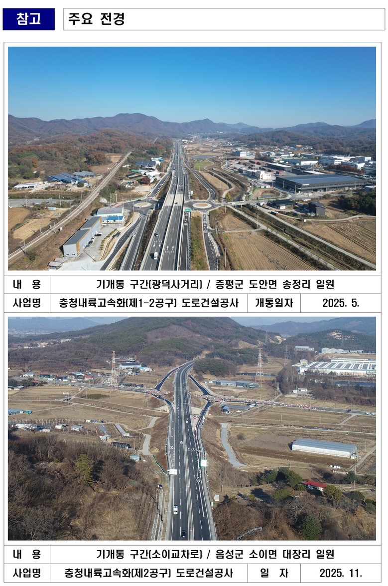 지난해 7월 충청내륙고속화도로 1-1공구(10.5㎞) 개통을 시작으로 잔여구간이 개통됨에 따라 충청내륙고속화도로는 2017년 첫 삽을 뜬 지 8년 만에 57.8㎞ 구간이 완전 개통됐다.