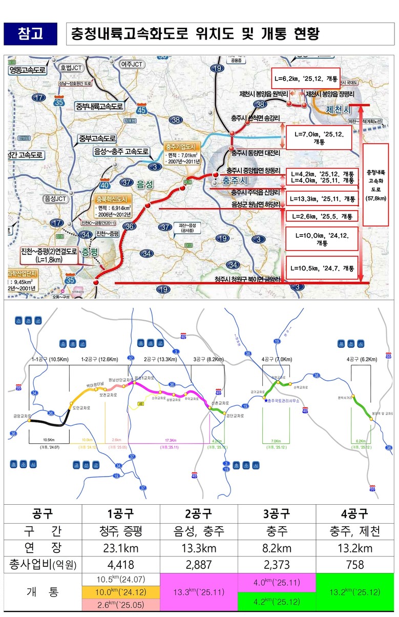 이처럼 충청내륙고속화도로의 큰 성과를 이룩하기 위해서 국토교통부와 충북도의 유기적인 협력이 주효했다. 총사업비 1조 436억 원이 소요된 이 사업에 전 구간 개통을 위해 최근 2년 동안 2,678억 원을 투입했다.