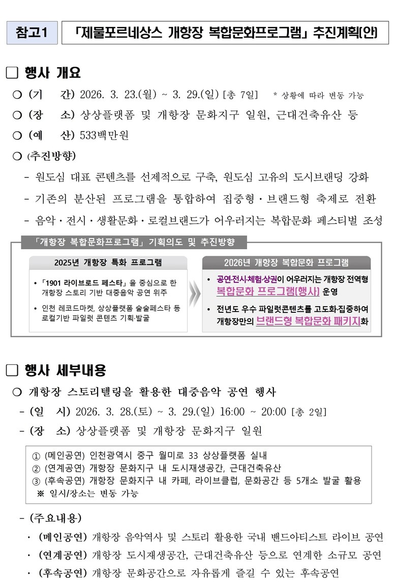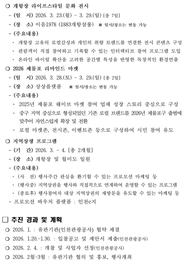 이를 위해 인천시는 이번 행사 수탁기관인 인천관광공사를 통해 1월 20일부터 1월 30일까지 「제물포르네상스 개항장 복합문화프로그램 운영」 사업자 공모를 실시하고, 시민이 직접 체감할 수 있는 공연·전시·지역상생 중심의 문화행사를 선보일 계획이다.