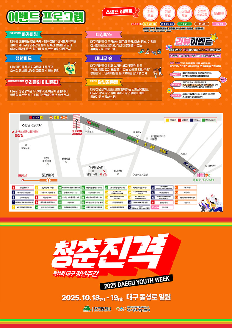 축제 기간 동안 동성로 곳곳에는 40여 개의 체험 부스도 운영한다. ▲속마음 전시 ▲24절기 콜라주 제작 ▲도심 생태계 타투 ▲업사이클링 반지 만들기 ▲청년정책 타임라인 전시 및 아카이빙 존 ▲프리랜서 오픈마켓 ▲청년체육관 등 다양한 체험과 전시를 즐길 수 있다.